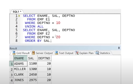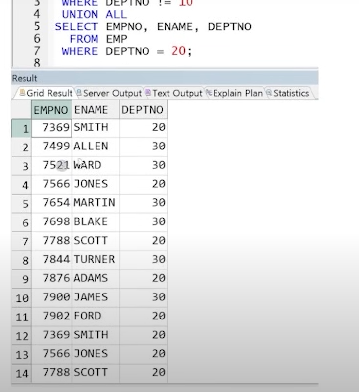 UNION ALL 수행 결과 다음과 같이 smith가 두 번 나오는 것을 볼 수 있다.