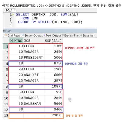 다음과 같이 deptno 별로 그룹핑 하고 그 내부에서 job 별 그룹핑한 결과가 나오고