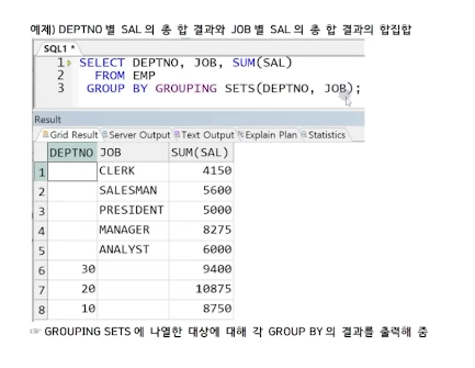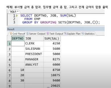 grouping sets는 deptno와 job로 요약된 정보를 전부 보여주는 역할을 수행한다.