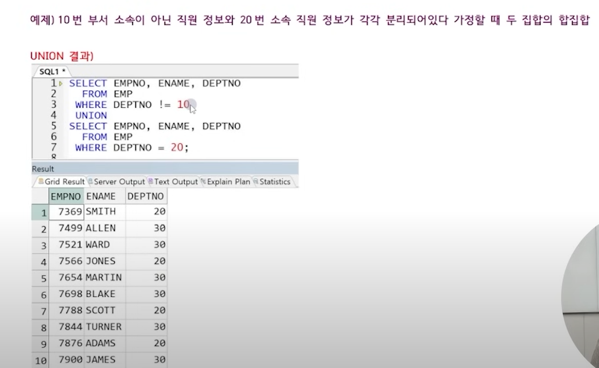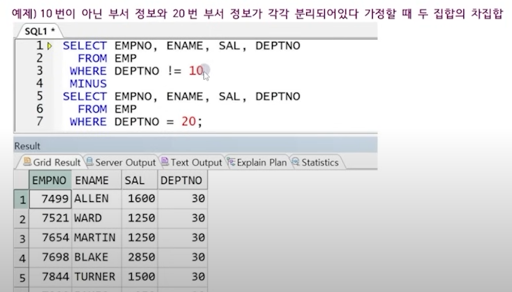- 집합 연산자는 하나의 쿼리다 즉 order by는 한 번만 들어가야 한다는 것이다.