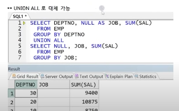 다만 위에 deptno로 group by했을 시 job은 표현이 불가능하니, NULL AS job으로 (as 는 별칭임!)