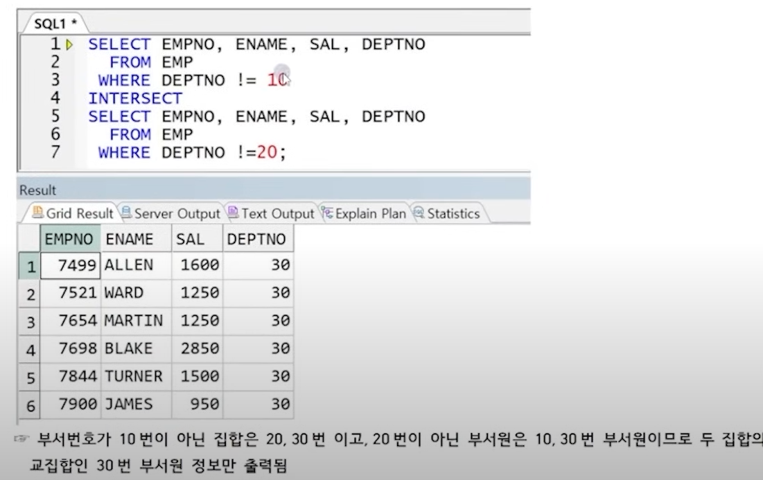 10번 아니고 20번 아닌 거의 교집합 이니까 30번 부서만 출력되는 것을 볼 수 있다.
